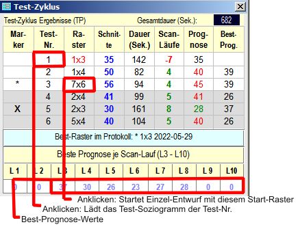 Beispielweise sucht es in der Protokoll-Datei nach einem früheren Entwurf mit geringster Schnittzahl. Wird der gefunden, erscheint das zugehörige Raster in der hellgrünen Zeile unter der Tabelle. Sofern dieses nicht bereits in einem Test-Zyklus schon benutzt wurde, wird es im 3. Test-Soziogramm als Start-Raster ausprobiert.